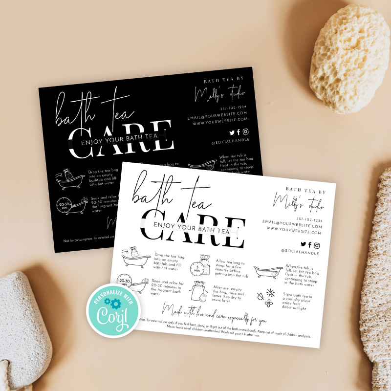 Add this minimalist bathtub teabag care card design to your orders to guide your customers on how to prepare the most relaxing bath. You can edit this tub tea bag care guide with your business logo and colors to make a personalised bath tub tea instructions PDF. This bath soak instructions guide is fully editable and you can print it at home or at your local print shop. Try out this bath tea safety card using the free demo link in the listing description. The perfect addition to your bath tea branding design!