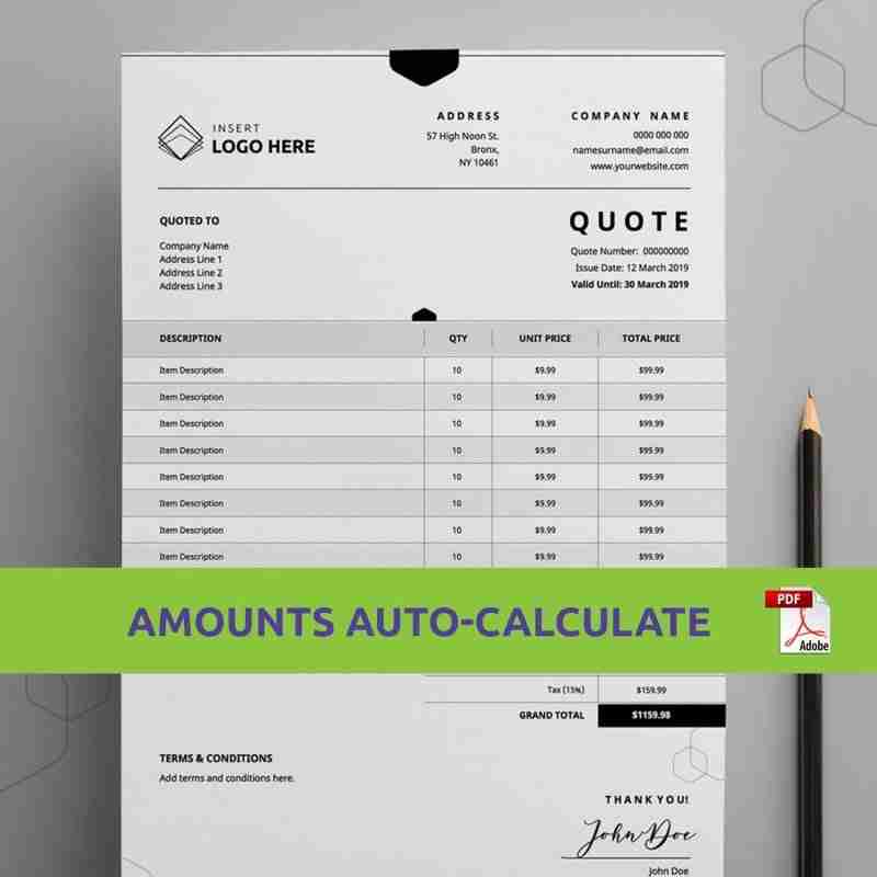 This is an Adobe PDF Business Quote Template with editable text and automated formulas.