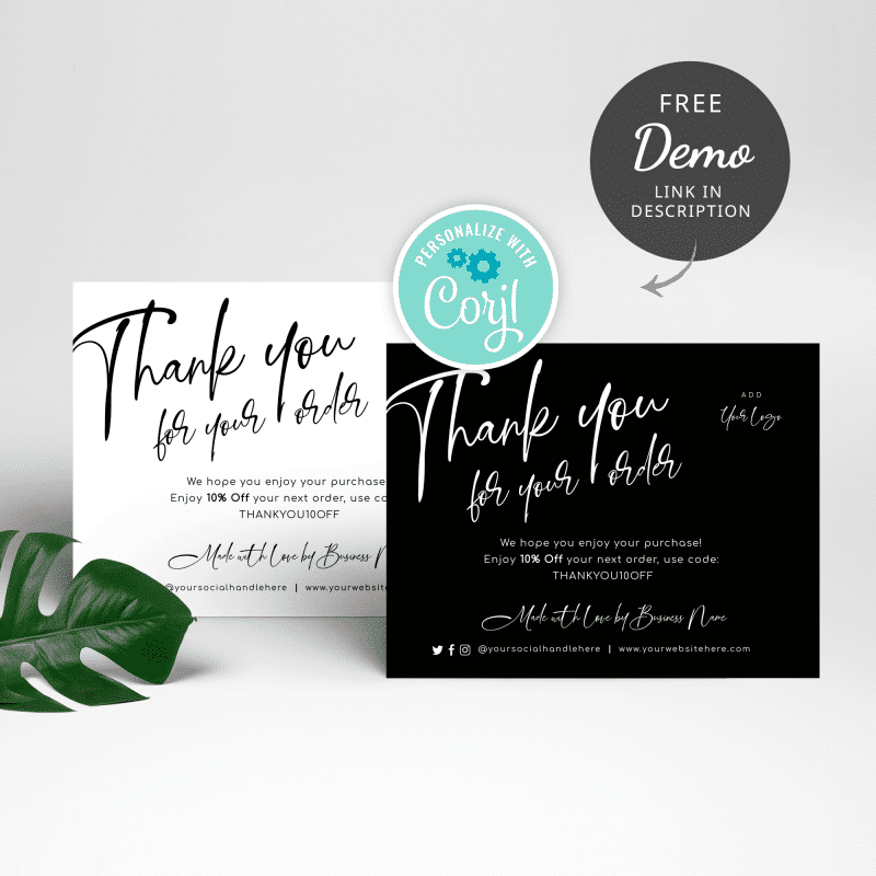 Create custom order thank you cards using this instant download editable thank you note template. Edit this thank you for shopping order insert design quickly and easily before printing. You can add your logo and edit the text to make your own thank you discount cards in minutes. Add these small business editable thank you notes to your packages to add the finishing touch to your orders. You can try this customer appreciation cards template in advance using the free demo link above. This design is the perfect addition to your packaging.