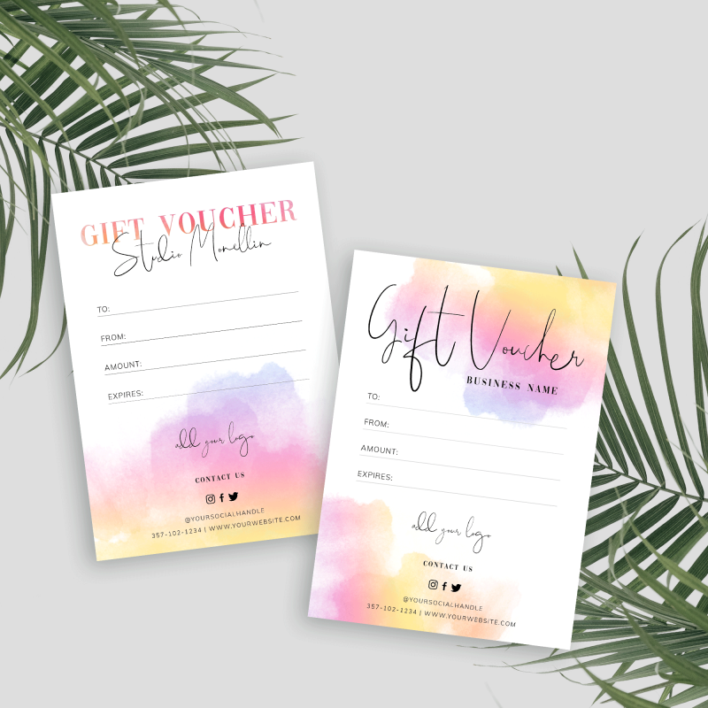 ***Please note the color and placement of the watercolor in the voucher template isn’t editable. You can delete the watercolor effect and/or change the solid background color.***